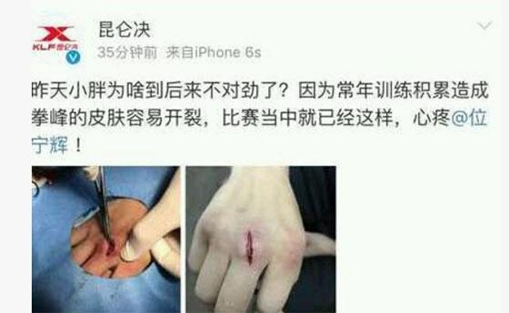 格斗迷讯 2017年2月26日,昆仑决57 在海南三亚举行。此次比赛中,“恐怖小胖”位宁辉 的精彩比赛给人印象深刻,但是比赛中位宁辉的手背拳峰受伤引起了广大拳迷极大的关注。