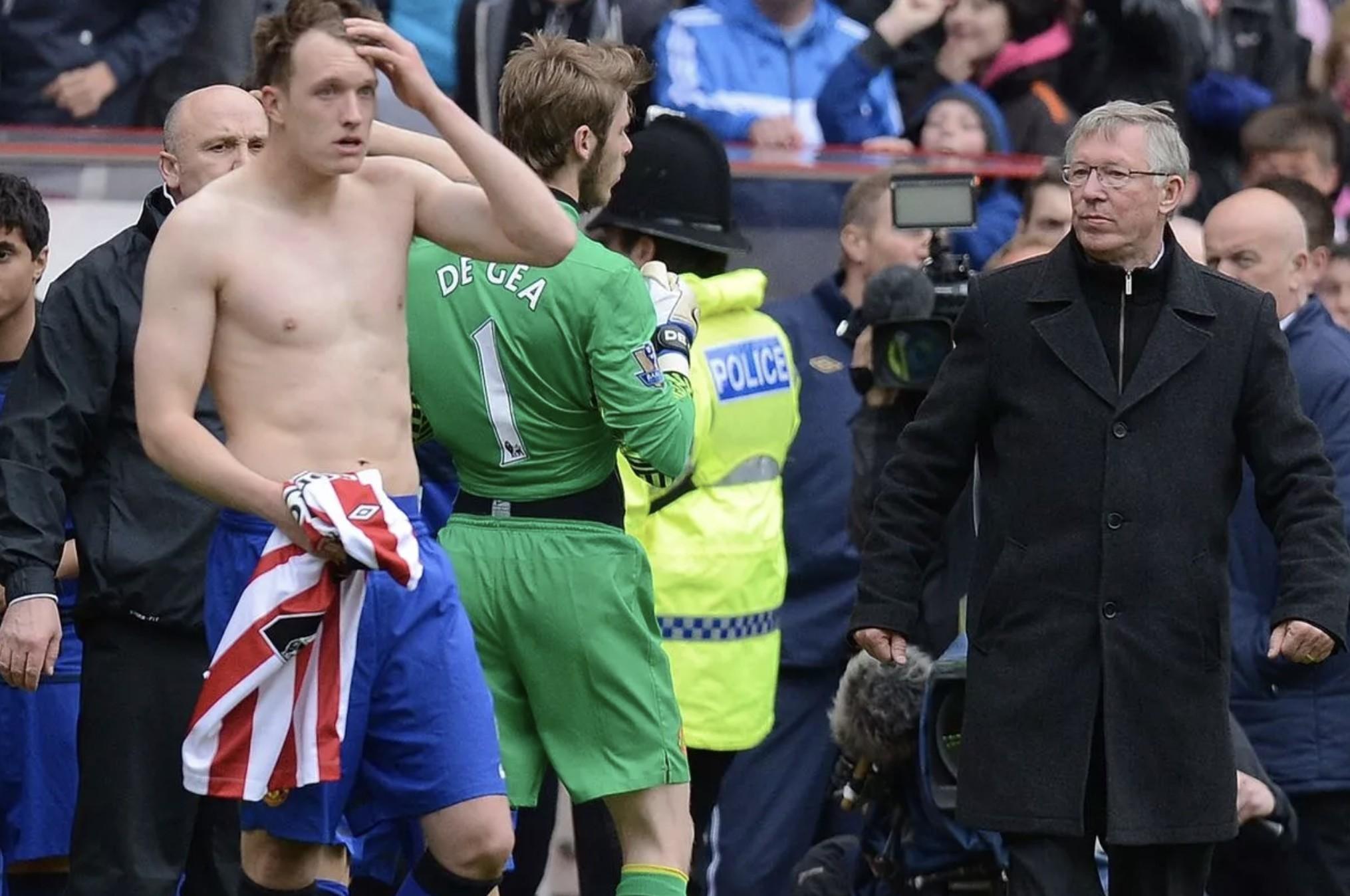 快乐、庆祝、戏剧、痛苦,这些元素依次在桑德兰主场上演。当曼联队1-0在客场击败桑德兰,弗格森、鲁尼和其他曼联球员们两眼放光,联赛冠军几乎已经到手,他们准备释放夺冠的喜悦,拥抱、微笑和击掌声此起彼伏。他们的竞争对手曼城在补时阶段1-2落后,即使取得平局也不会影响曼联夺冠的结果。就在一瞬间,观众席上泛起了一阵骚动,曼联的球员们开始议论,弗格森向天空体育的比赛制作人问道:“他们进球了?”对方回复以毁灭性的点头,阿圭罗在94分钟绝杀女王公园巡游者,曼联以净胜球劣势丢掉了即将到手的联赛冠军。弗格森爵士很冷静,他没有流露出任何可能被对手利用的软弱情绪,他走向来到客场的曼联球迷,示意他的球员们跟上他,带头向球迷致谢。他就像一位不让敌人看到自己失落情绪的将军。
