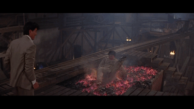 但在拍摄电影最后炼钢厂大战的重头戏时,成龙和刘家良的意见却发生了分歧,最后刘家良退出了剧组。成龙则完全接管了这场高潮戏的拍摄,他给了自己的保镖卢惠光一个展现腿功的机会。