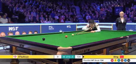 这杆147在清彩阶段也颇具悬念,足够考验球迷的心脏。第一个难点在于白球稍稍走多后的黄球,丁俊晖利用准度打进。