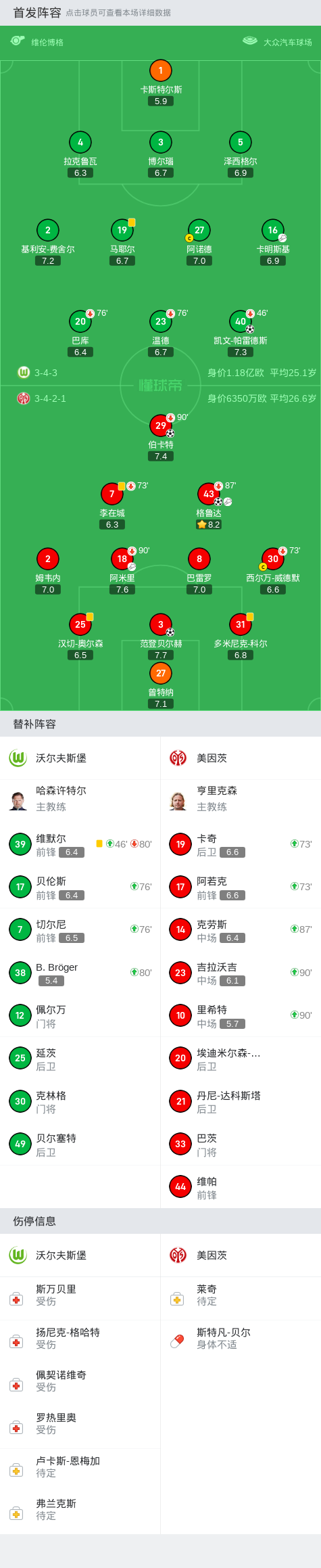 第18分钟,沃尔夫斯堡球员卡明斯基助攻凯文-帕雷德斯打入一球。