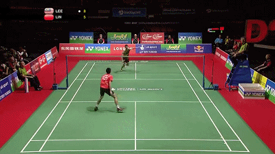 林丹勾对角,李宗伟在网前停顿,假放真推,将球推到林丹后场,林丹迅速二次启动跨步抽球,虽然将球救回,但李宗伟正在网前等待,将球扑死,如下图: