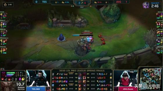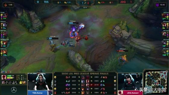 TES清完了大龙坑视野尝试偷大龙被发现,女枪净化秒解了TES的控制开大反打,丽桑卓被JDG逼出大招无力作战,JGD一路追击打出1换3,复活的盲僧趁机偷到水龙。26分钟TES上、中强抓下路单带的奥恩,奥恩坦度无解拖到队友赶到,TES两人双双倒地。随后的水龙团战中奥恩深入敌后终结了厄斐琉斯,盲僧临死前硬换了奥恩,JDG无压力收下大龙,拆了TES中路水晶,经济实现反超并转身解锁了水龙魂,瑟提传送绕后被奥恩大招打出闪现。34分钟奥恩在TES的红buff野区大招击飞两人,JDG打出0换4一波结束比赛,成功逆风翻盘TES,1-0拿到决赛开门红!