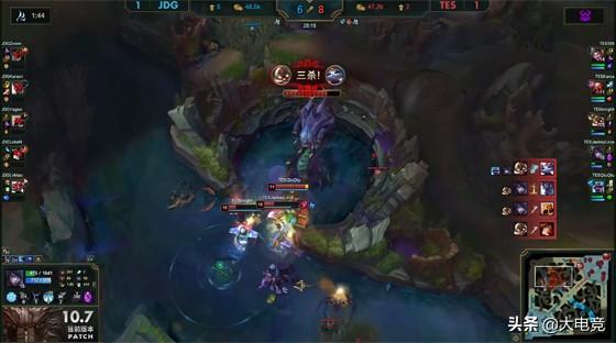 尽管JDG打出一波大节奏,但阵容上还是TES在这个时候更主动,盲僧在上路抓死船长,下路女枪击杀了厄斐琉斯,打断了JDG最肥的两个点位的发育。TES逐渐夺回了比赛的主导权,连续控下两个峡谷先锋和三条小龙,中路一塔被迫导致妖姬的游走空间也受到了很大限制。