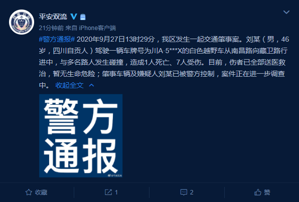 新京报快讯 据@平安双流 消息,2020年9月27日13时29分,我区发生一起交通肇事案。刘某(男,46岁,四川自贡人)驾驶一辆车牌号为川A·5***X的白色越野车从南昌路向藏卫路行进中,与多名路人发生碰撞,造成1人死亡、7人受伤。目前,伤者已全部送医救治,暂无生命危险;肇事车辆及嫌疑人刘某已被警方控制,案件正在进一步调查中。