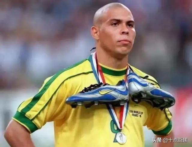 图4 比赛结束后,脖子上挂着一枚银牌和一双NIKE足球鞋的大罗久久不愿意离开,更多是完成任务——为NIKE打广告,这也是为什么他“犯病”导致状态全无仍上场比赛的原因