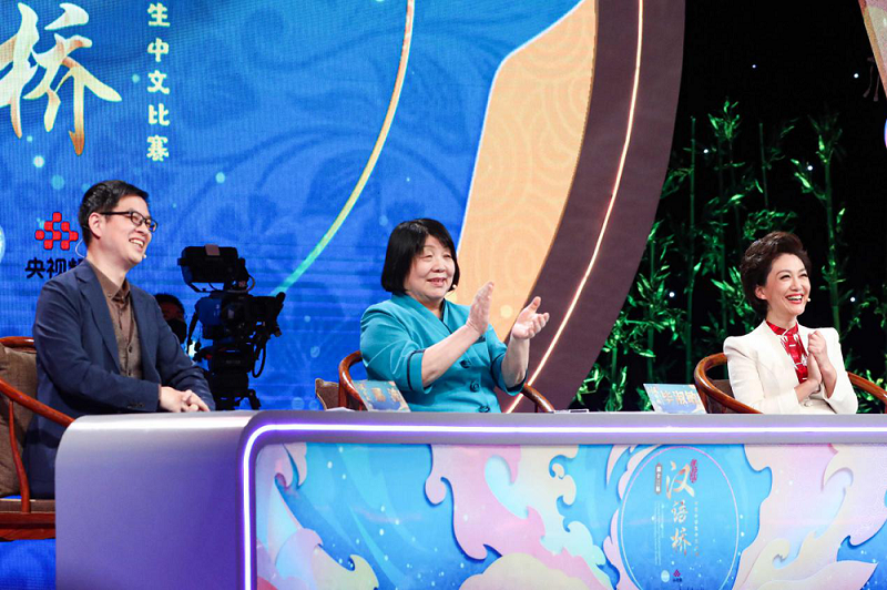△“汉语桥”评委(从左往右依次:郦波、毕淑敏、海霞)