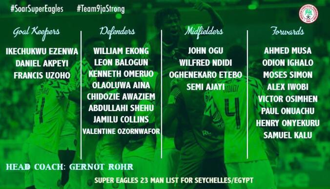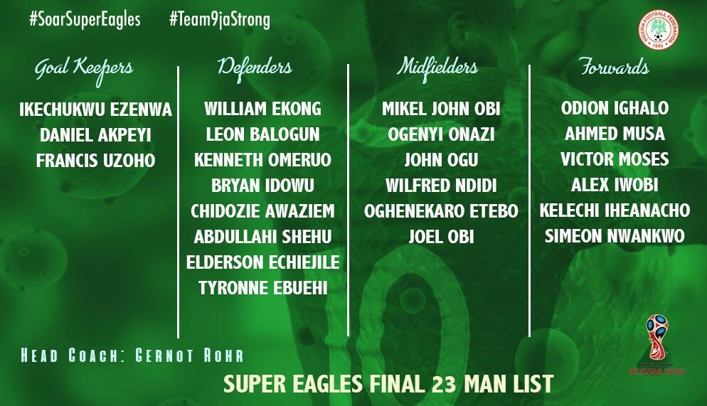 直播吧6月3日讯 尼日利亚官方公布了出征俄罗斯世界杯的最终23人大名单,泰达中场米克尔、阿森纳边锋伊沃比、亚泰前锋伊哈洛入选。