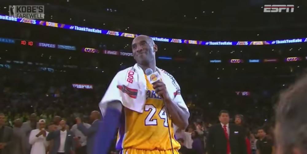 赛后,科比在球场中心发表退役演讲与球迷们告别。