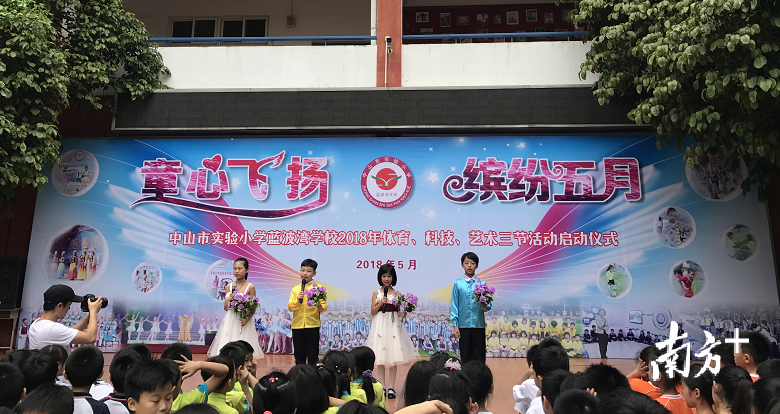 5月11日上午,中山市实验小学蓝波湾学校2018年体育、科技、艺术三节活动暨2018年校园足球嘉年华启动。启动仪式上,还有舞蹈、乐器演奏等表演,萌娃们才艺尽显。