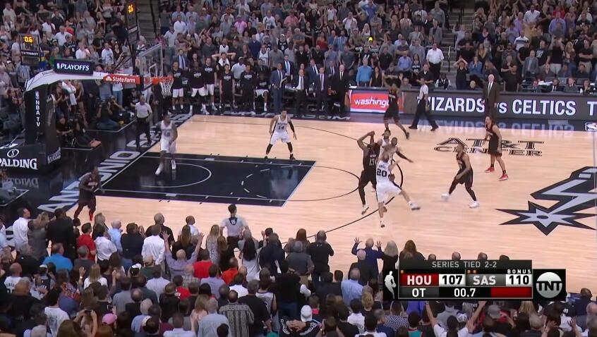 加时赛中,吉诺比利连续送出2次助攻,帮助丹尼-格林拿下5分,马刺后来居上反超比分。随着格林两罚一中,终场前16秒,马刺以110-107领先。暂停回来,火箭进攻机会,埃里克-戈登背后运球险些失误,裁判吹罚争球,莱恩-安德森拿到皮球交给哈登,火箭13号在左侧三分线起跳出手三分,吉诺比利斜刺杀出在背后送上结实一帽,戈登捡到皮球出手投进三分,但是已经超时!马刺获得了最后的胜利!