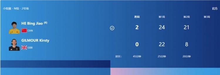 最终,何冰娇以24-22、21-8直落两局,总比分2-0击败对手取得小组赛2连胜,拿到小组第一晋级淘汰赛。