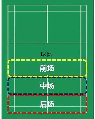 除了左右分区,平时我们还会将场地分为前场和后场,或者是前场、中场和后场,这样更能加深对场地的理解。