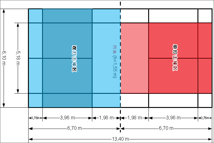 在常见的羽毛球比赛中,一般分为:单打和双打。所以羽毛球场地也分成单打和双打界限,如下图所示:红色代表单打界限,蓝色代表双打界限。
