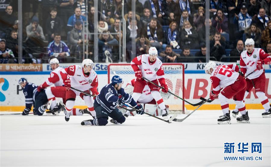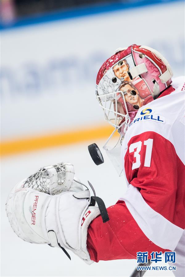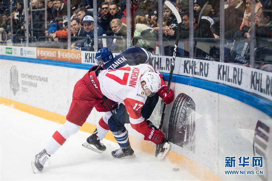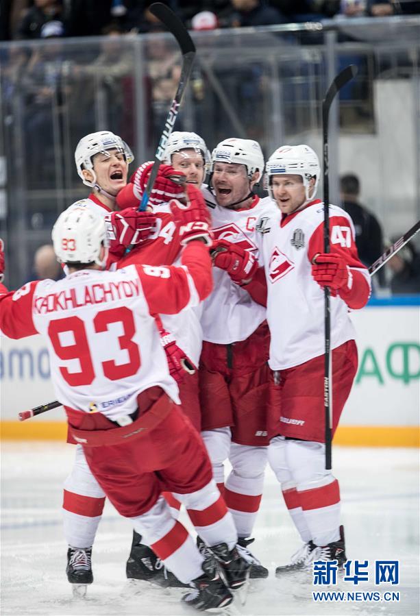 ↑1月18日,斯巴塔克队球员在比赛中庆祝进球。当日,在2017-2018赛季大陆冰球联赛(KHL)的一场比赛中,莫斯科斯巴达克队客场以5比4战胜莫斯科迪纳摩队。 新华社记者吴壮摄
