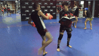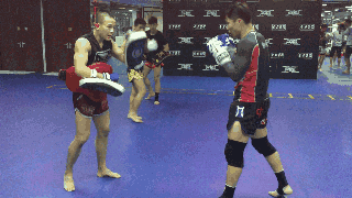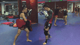 当然如果只练习拳法的话,靶师会给你扶手靶(focus mitts),低扫练习也有专用的低扫靶(low kick shield)