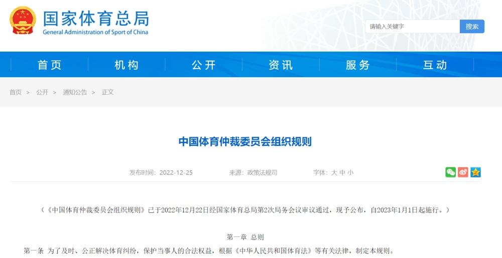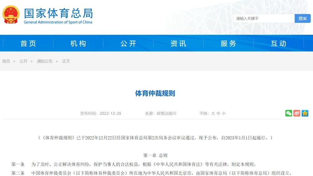 12月25日,国家体育总局在网站上发布《体育仲裁规则》和《中国体育仲裁委员会组织规则》,这两项规则将于2023年1月1日起施行。