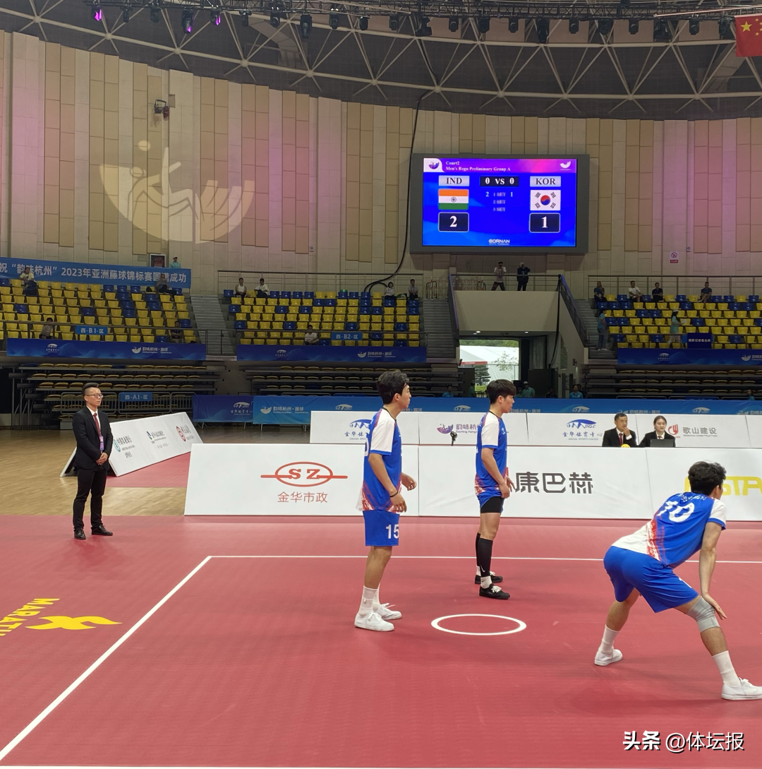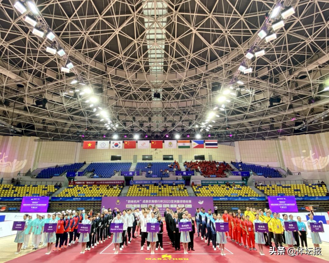 这是6月20日在金华体育中心体育馆上演的一幕。中国、泰国、印度、韩国等7个参赛代表团以及技术官员齐聚于此,拉开了“韵味杭州”亚洲藤球锦标赛 的序幕,未来几天这里将上演24场激烈比赛。