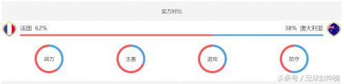 根据上表,法国队在战力、主客、进攻、防守上均胜于澳大利亚队。实力分析法国队62%的平均实力大于澳大利亚队38%的平均实力。(意思就是法国队有62%的概率获胜)