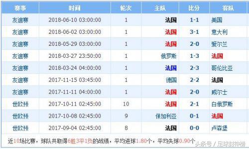 法国近10场比赛,球队共取得6胜3平1负的战绩,平均进球1.80个,平均失球0.90个。