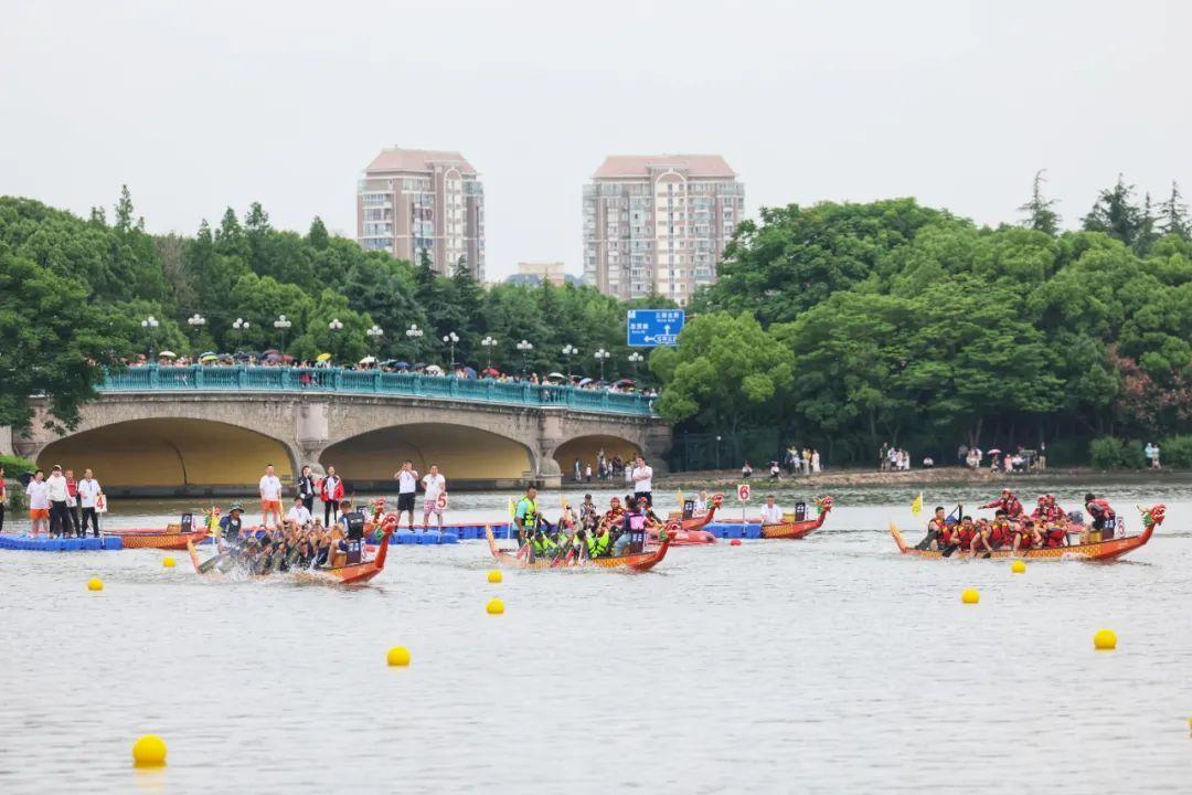 开幕式后,发令枪响,一条条参加决赛的龙舟好似蛟龙出水,沿着200米的赛道奋勇前进。一时间湖面百舸争流、劈波斩浪,两岸市民齐声呐喊助威。浪花、龙旗、鼓声、呐喊,融成一片,也把比赛推向高潮。经过一上午紧张激烈的比赛,岳阳街道龙舟队、松江教育龙舟队分获街镇组和公开组的桂冠。