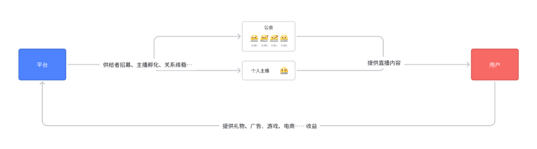 所以我们要先盘下直播行业的业务模式,直播行业的业务模式简单概括就是:
