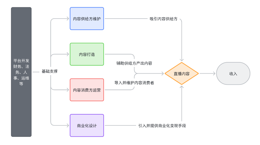 直播平台公司属于互联网公司的一个变种(虽然也有不少不同),除了平台开发给到直播业务一个载体平台外,还需要像是人事、法务、运维、财务这些基础支撑岗位,此处不展开赘述。