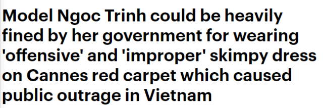 据英国《每日邮报》消息,Ngoc Trinh很可能会因她在戛纳红毯上“争议性”和“不恰当”的暴露礼服被越南政府严重处罚。该造型引起了越南公众的不满。