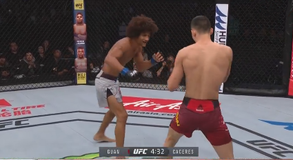 UFC第十场大战一开始:美国选手艾利克斯先是打出一套太极拳来震慑东北虎王冠,但似乎并未奏效,东北虎王冠开始就重拳轮摆,刚刚接触到一起王冠就被艾利克斯提膝击中裆部,王冠在休息了大概1分钟后又回到了擂台,以迅雷不及掩耳之势猛冲重击美国选手艾利克斯,之后两人互拼拳法,美国选手艾利克斯一拳打空被王冠前手拳打中,倒地后被王冠连续重拳砸击,险些被KO,最后铃声挽救了艾利克斯。
