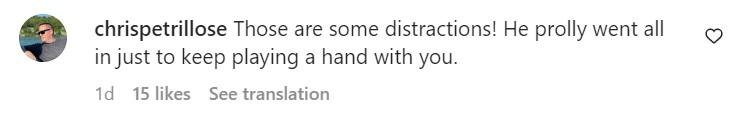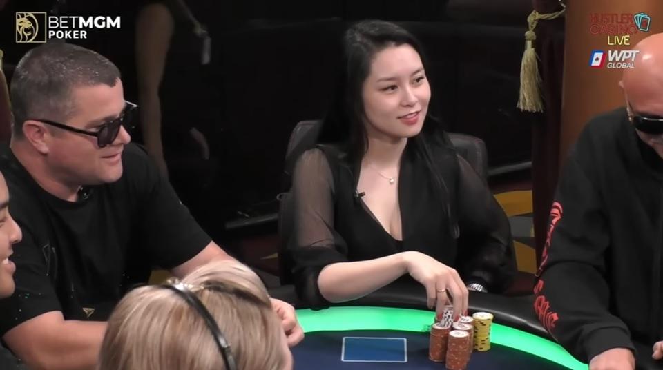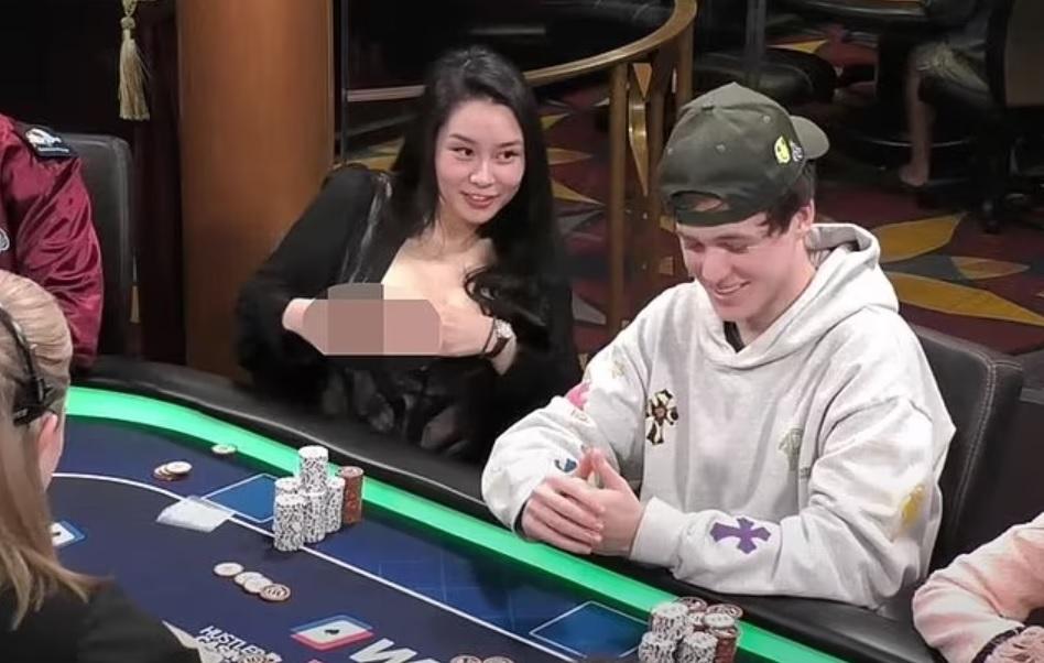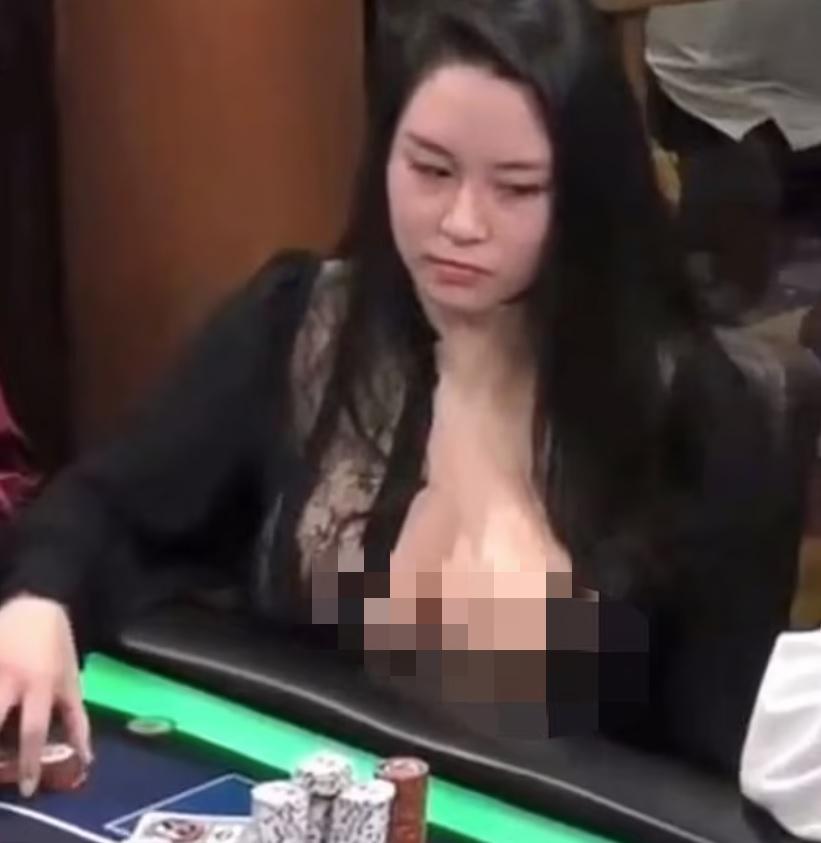 可这周一,她和尼克·奥斯丁(Nick Austin)、达伽(Daga)等对手打牌时,穿了一件几乎遮不住胸的黑丝上衣。不知道是这件衣服的领口太大,还是衣服的扣子根本没扣(应该是后者),胸口部位大剌剌地露出来。