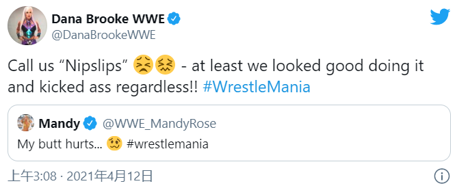 而戴拿也在推特上回复了曼迪的推文,并拿自己的走光时间开涮: