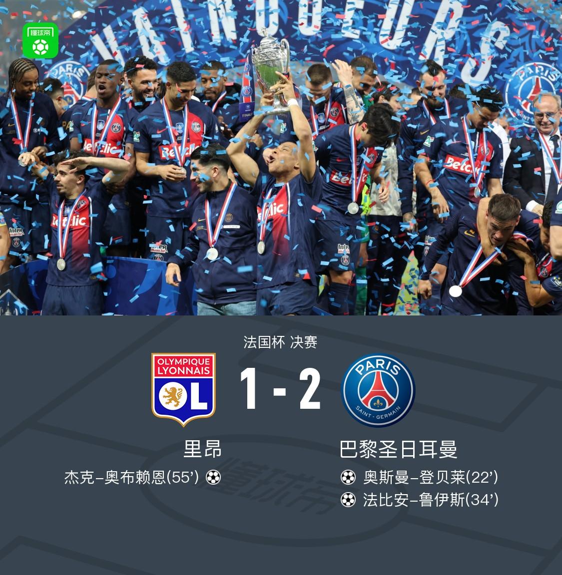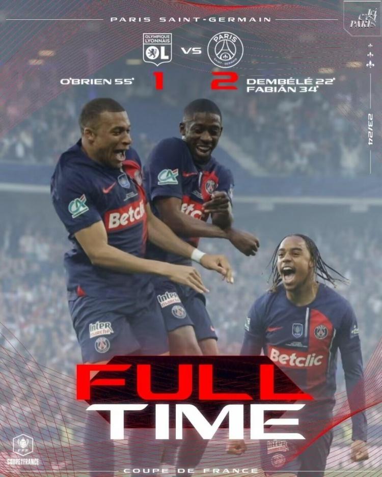 北京时间5月26日凌晨3点,2023-24赛季法国杯决赛在里昂和巴黎圣日耳曼之间展开,这也是姆巴佩在巴黎圣日耳曼的告别战。上半场,登贝莱破门帮助巴黎圣日耳曼取得领先,法比安-鲁伊斯进球扩大比分;下半场,奥布赖恩为里昂扳回一球,姆巴佩打满全场。最终,巴黎圣日耳曼2-1战胜里昂,夺得队史第15座法国杯冠军,加冕联赛和杯赛双冠王。