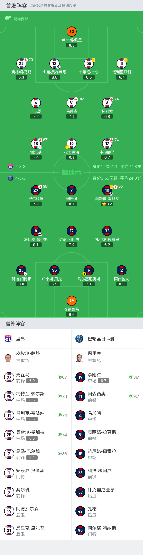 里昂首发:23-佩利、55-卡莱塔、12-杰克-奥布莱恩、22-克灵顿(74' 98-奈尔斯)、3-塔利亚菲科、6-卡奎雷特、8-托利索(74' 25-奥雷尔)、31-马蒂奇(86' 7-巴尔德)、17-本拉赫马(74' 11-马利克)、18-切尔奇(67' 37-欧内斯特)、10-拉卡泽特