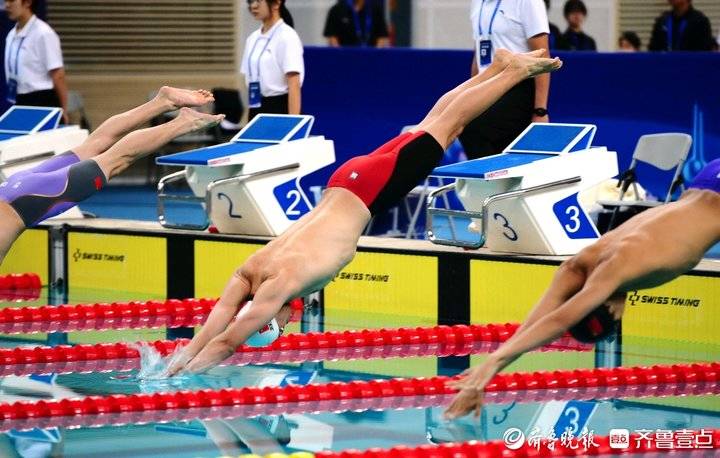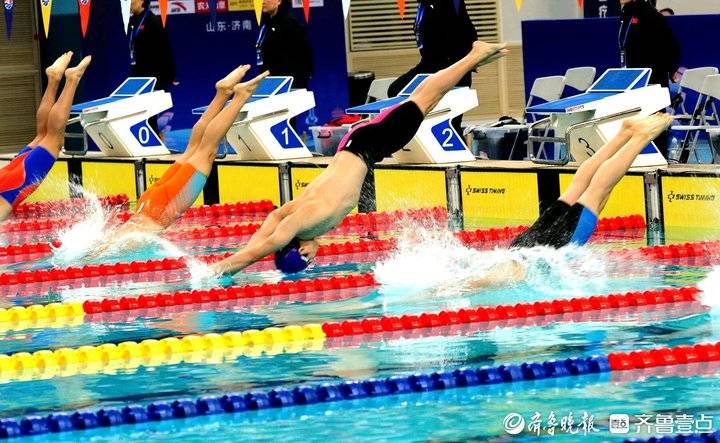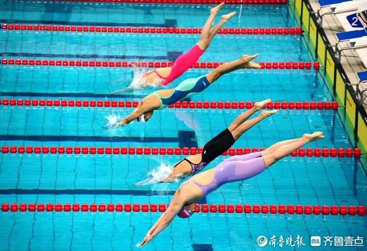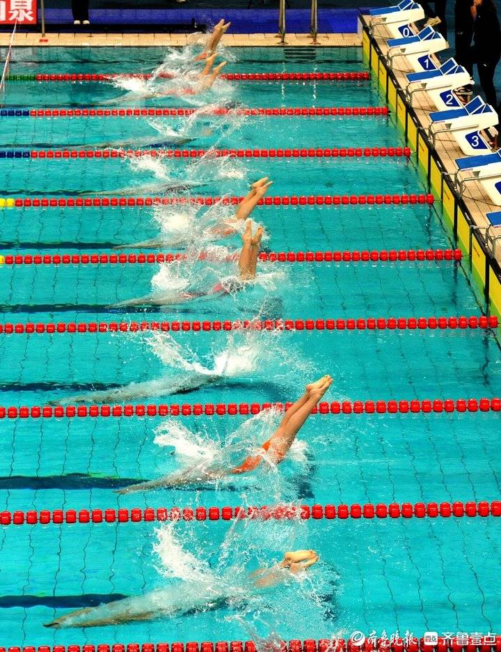 来自全国各省市的游泳健将们奋力拼搏,当他们起跳入水时,在空中划出优美的曲线。