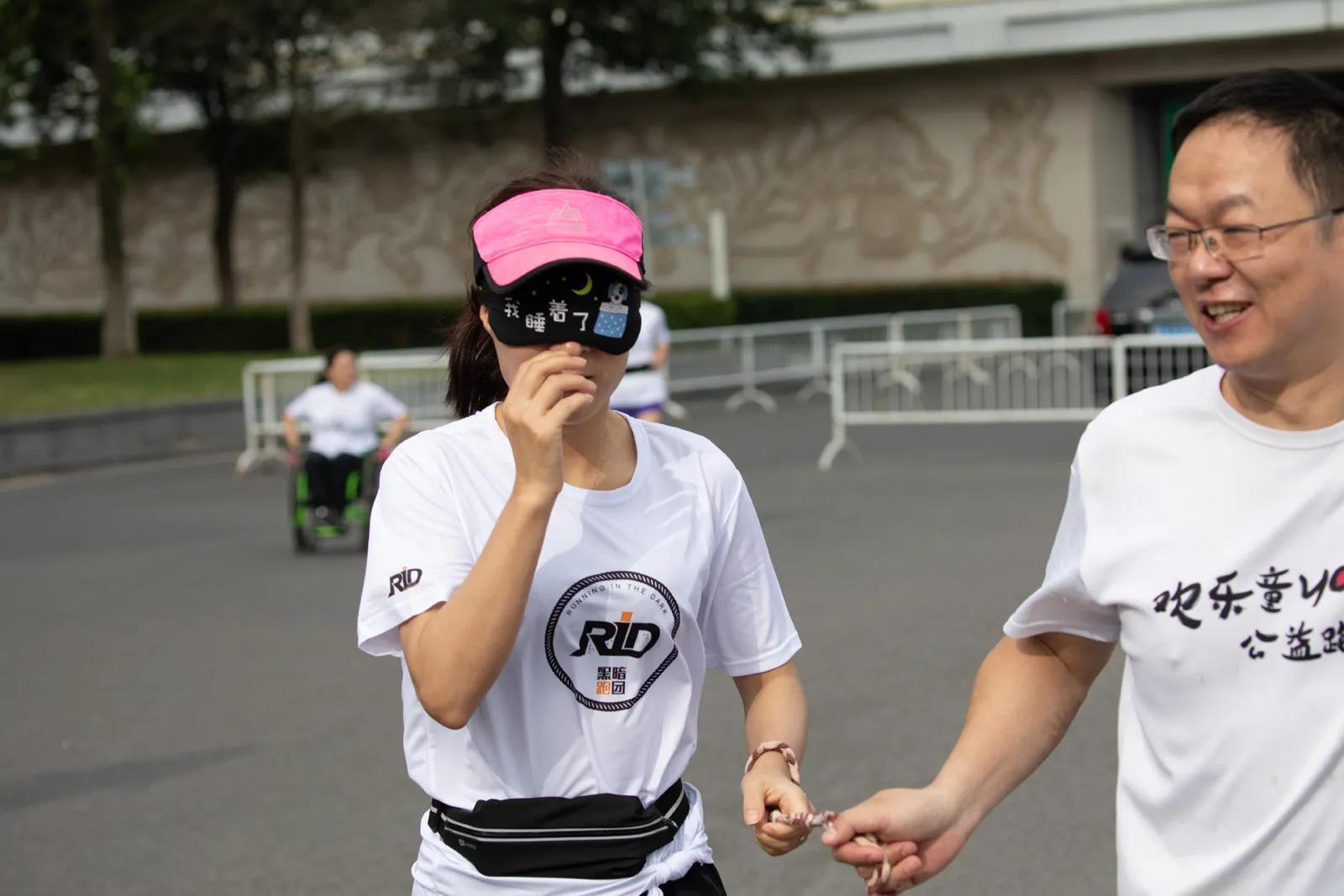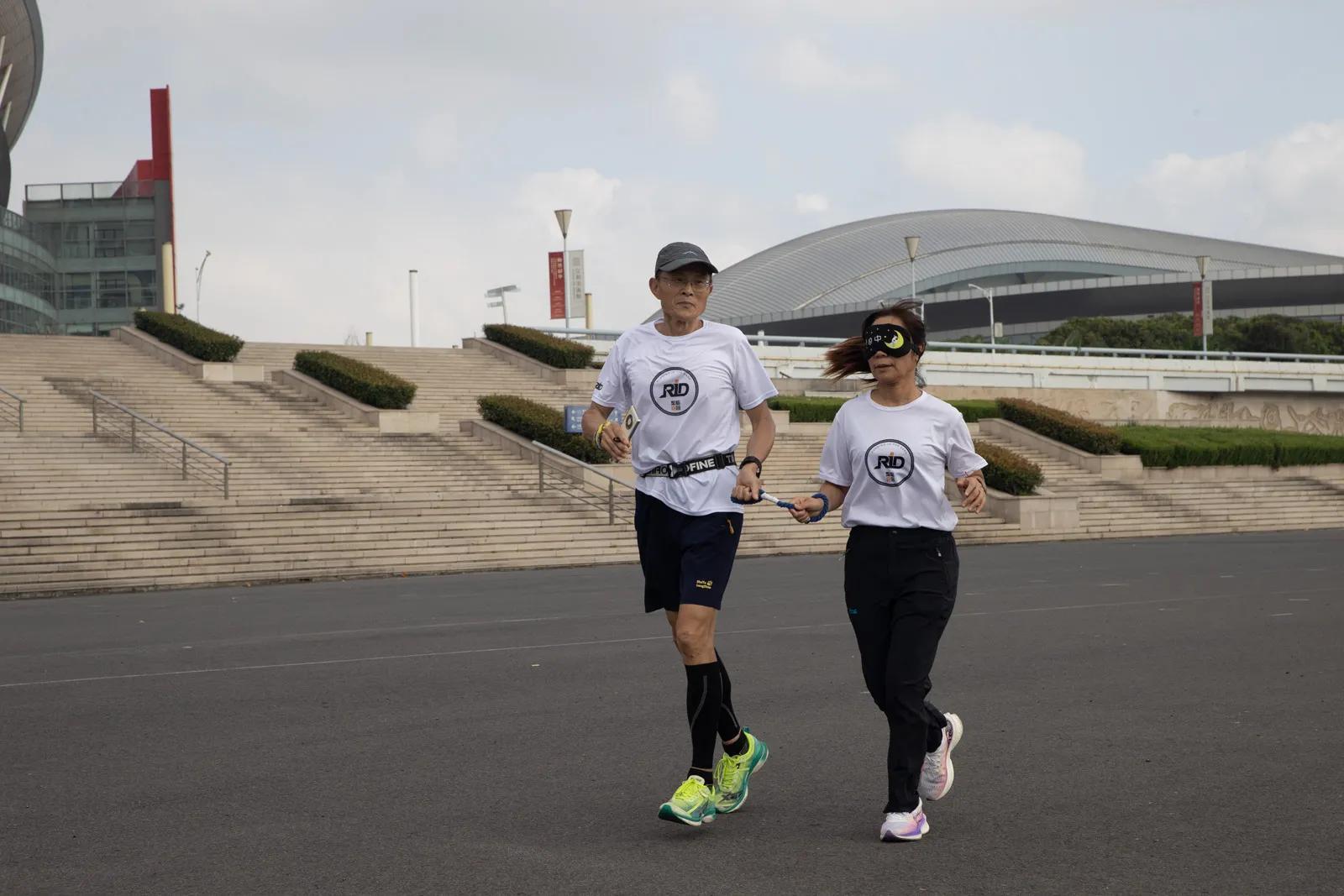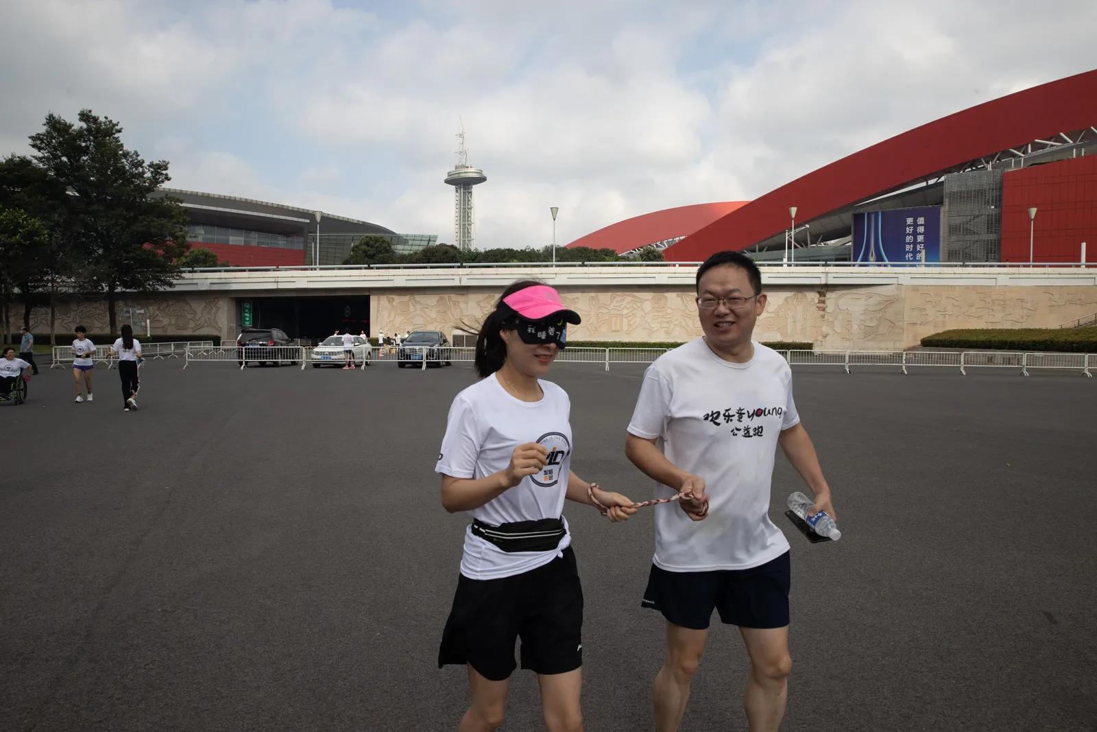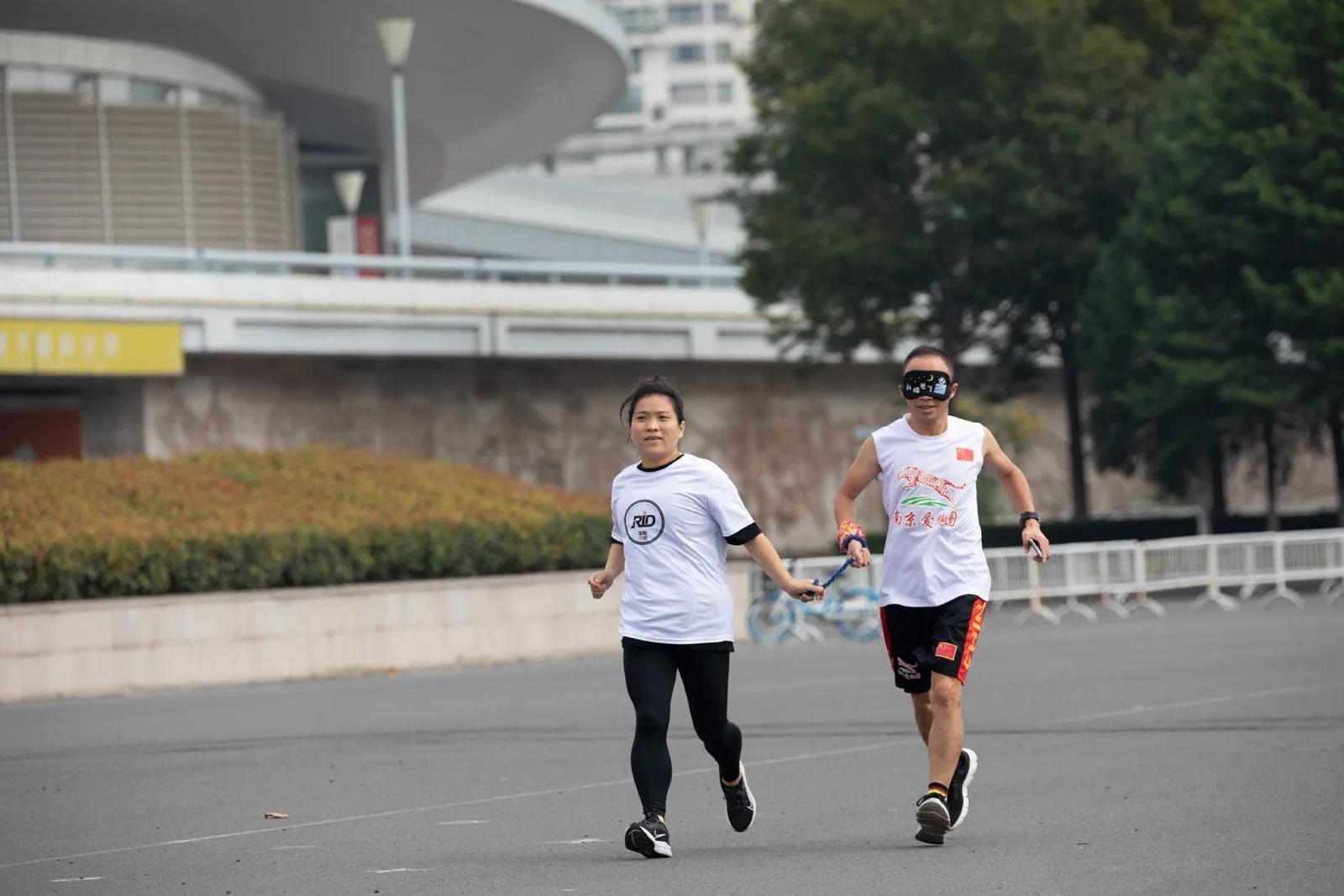 我短暂的体验了一下带上眼罩跑步。当时是我的搭档另一位女生先体验的,在我把牵引绳缠在她手上,给她带上眼罩时,她跟我说她很害怕她不敢跑。我很费解,因为按照之前了解的注意事项,牵引绳保持一个弯曲的弧度,我的右臂挨着她的左手,我也在旁边一直轻声告诉她前方的路况是安全无障碍的,我以为我已经在听觉和触觉给了她很大的安全感。但是她还是不敢迈腿。然后换我体验时,我才懂了那种感觉,带上眼罩的第一感觉是害怕,我的双脚就好像被束缚在了原地动弹不得。我担心会撞上左边的栏杆,会撞上右边的行人,担心我会撞上前方的车辆。我试着慢走了几步,我发现处于失明状态的自己根本无法行走,更别提奔跑。我急切的想要摘下眼罩,想要看清我前面的路到底是否平坦。当我摘下眼罩,看见太阳的时候,我突然想到,奔跑的视障患者他们是怎么一点点克服这种恐惧,在一片黑暗的环境里一点点的试着迈出腿,去拨开前面黑暗的路障,去完全相信带领自己的人。我相信他们比我们更害怕,更恐惧,他们又比我们想象的更勇敢,更优秀。