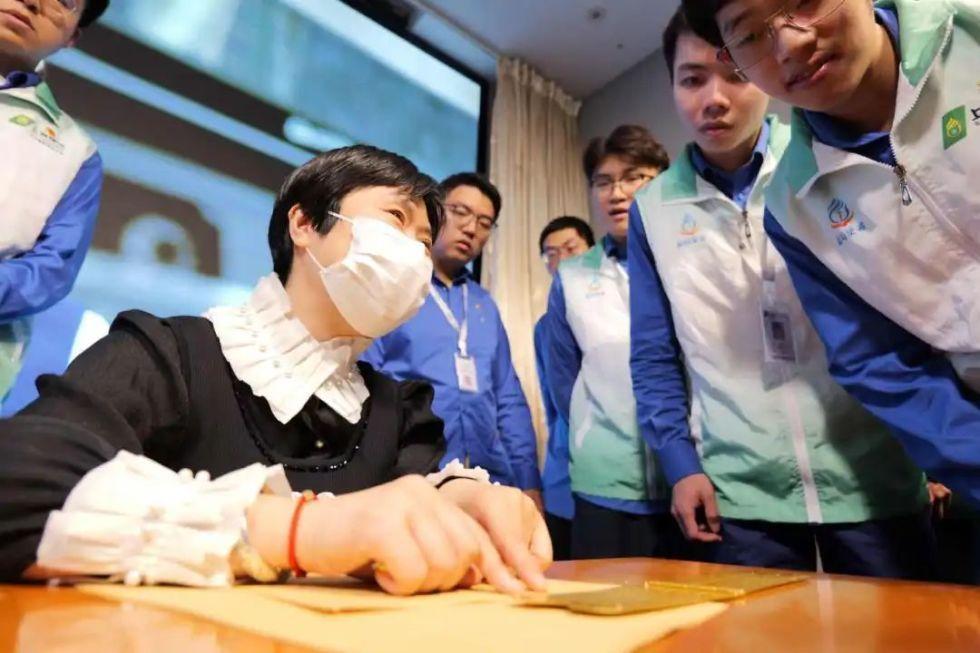 所谓教学相长,在为盲人授课之前,“蓝焰使者”们在浦图现场接受了浦东助残志愿服务中心培训老师、四级视力障碍者梅丽青的助盲培训。在实操环节,“蓝焰使者”两两结对,分别扮演视障者和志愿者,学习了如何协助盲人日常行走、过狭窄通道、上下楼梯、引导入座等基本助盲技巧,还戴上眼罩“观看”了无障碍电影《奇迹男孩》,了解盲文的书写与阅读,走进不一样的世界。“蓝焰使者”们有感而发:“盲人的生活真的不容易,他们身边的安全隐患真的需要一一排除!”