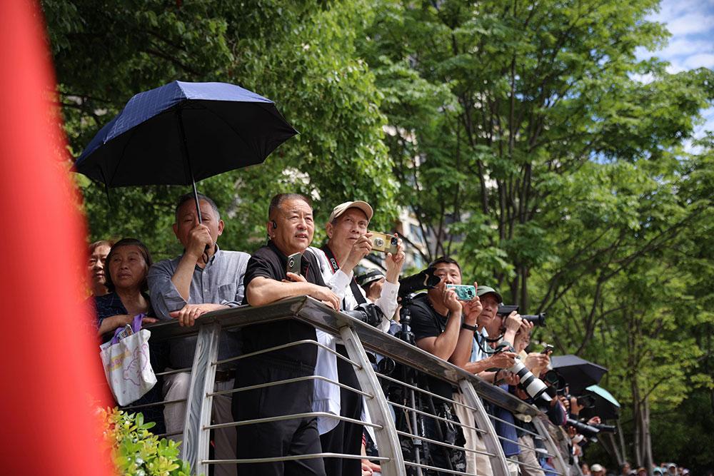 水波潋滟,阳光灿烂,初夏的苏州河畔风景美如画,附近的居民也都纷纷前来观赛。“我是住在这附近的居民,听邻居说有龙舟赛,端午节也是我们中国的传统佳节,所以每年这个时候我都会带孩子过来看一看,看到运动员这么努力地划龙舟,让孩子感受一下团队协作的拼搏精神。”市民感叹道。苏州河畔千帆竞渡,河岸旁不少观摩赛事的市民纷纷拿出手机、相机,记录下这个壮观的场面。