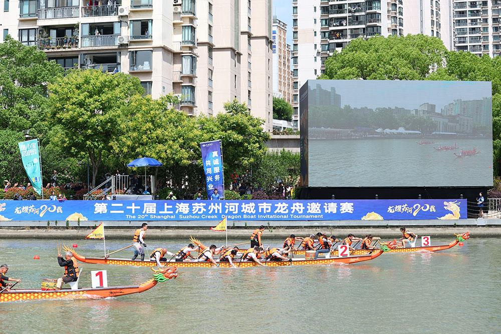 6月1日、2日,第二十届上海苏州河城市龙舟邀请赛在普陀区中远两湾城·梦清园水域燃情开桨。来自不同国家和地区的36支队伍700多名运动员劈波斩浪、奋楫竞渡,共同带来一场“龙舟盛宴”。
