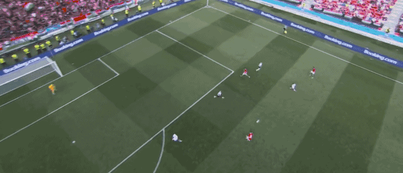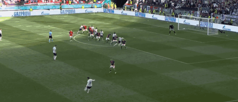 上半场比赛,法国队久攻不下,尽管场面上占据主动并多次创造得分机会,但并未转化为进球。补时阶段,匈牙利后卫菲奥拉反击中禁区左肋甩开瓦拉内突入禁区,推射近角破门。这是本届欧洲杯匈牙利队的首粒进球也是法国队的首粒失球,近乎满座的普斯卡什体育场陷入疯狂。半场战罢,匈牙利暂时以1-0领先。