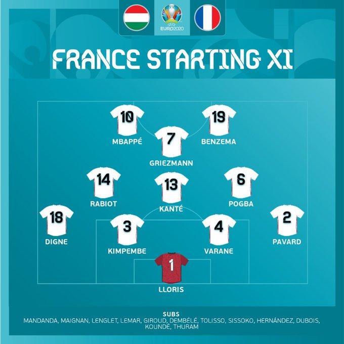 法国首发:洛里、帕瓦尔、金彭贝、瓦拉内、迪涅、博格巴、坎特、拉比奥特、格里兹曼、姆巴佩、本泽马。