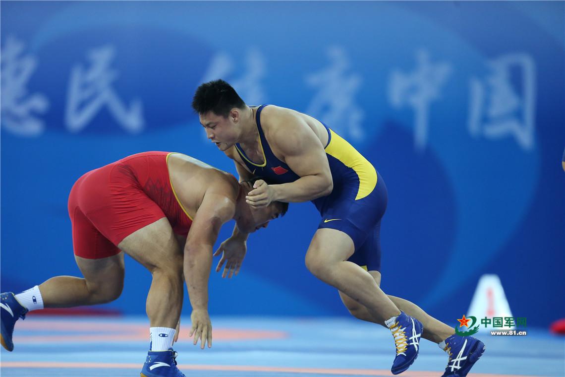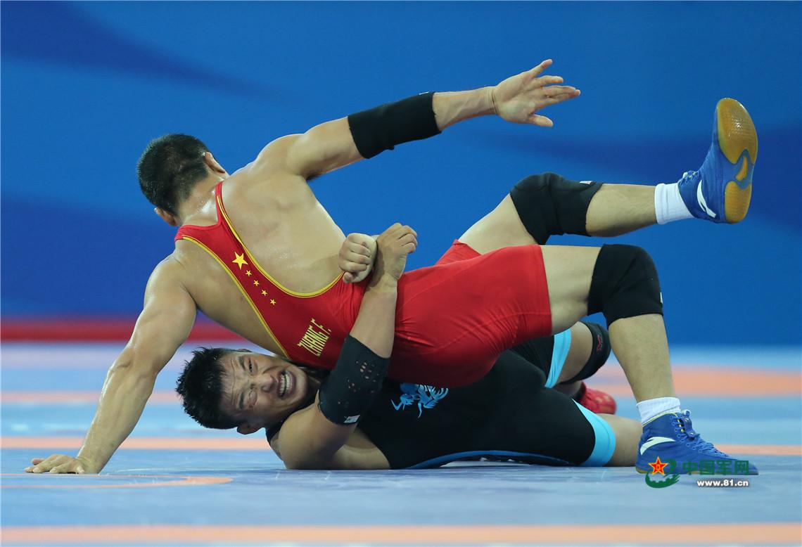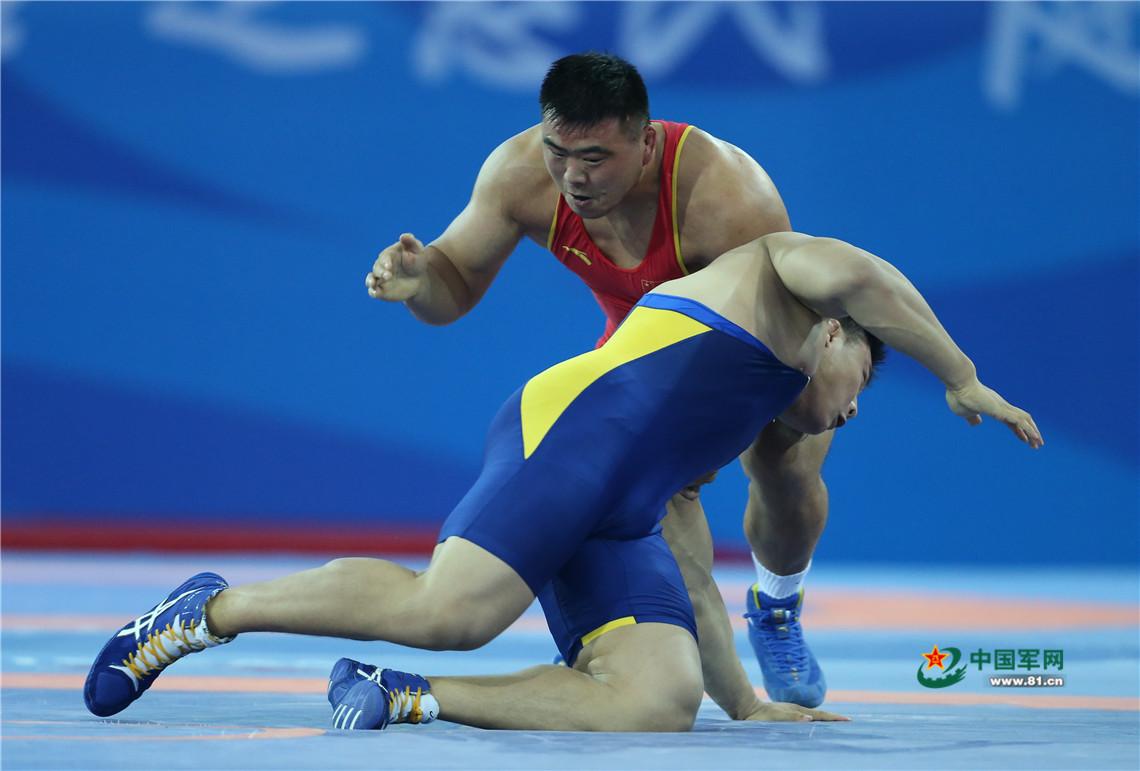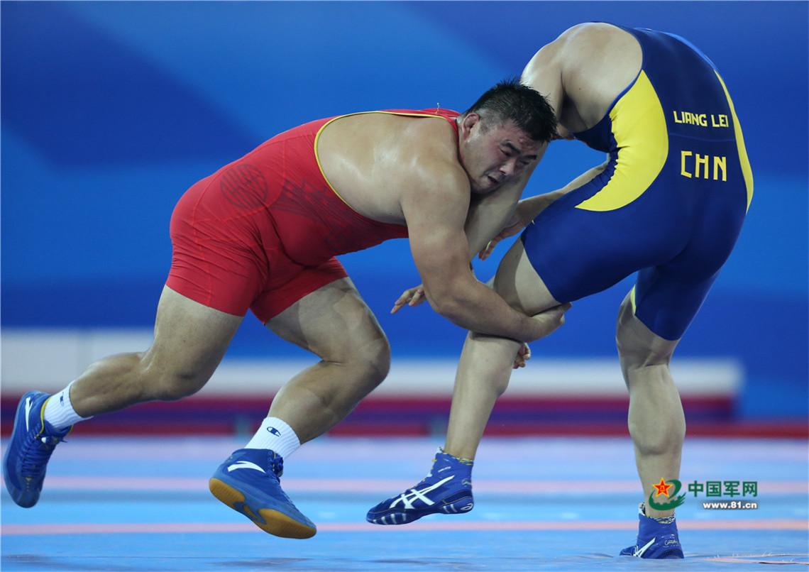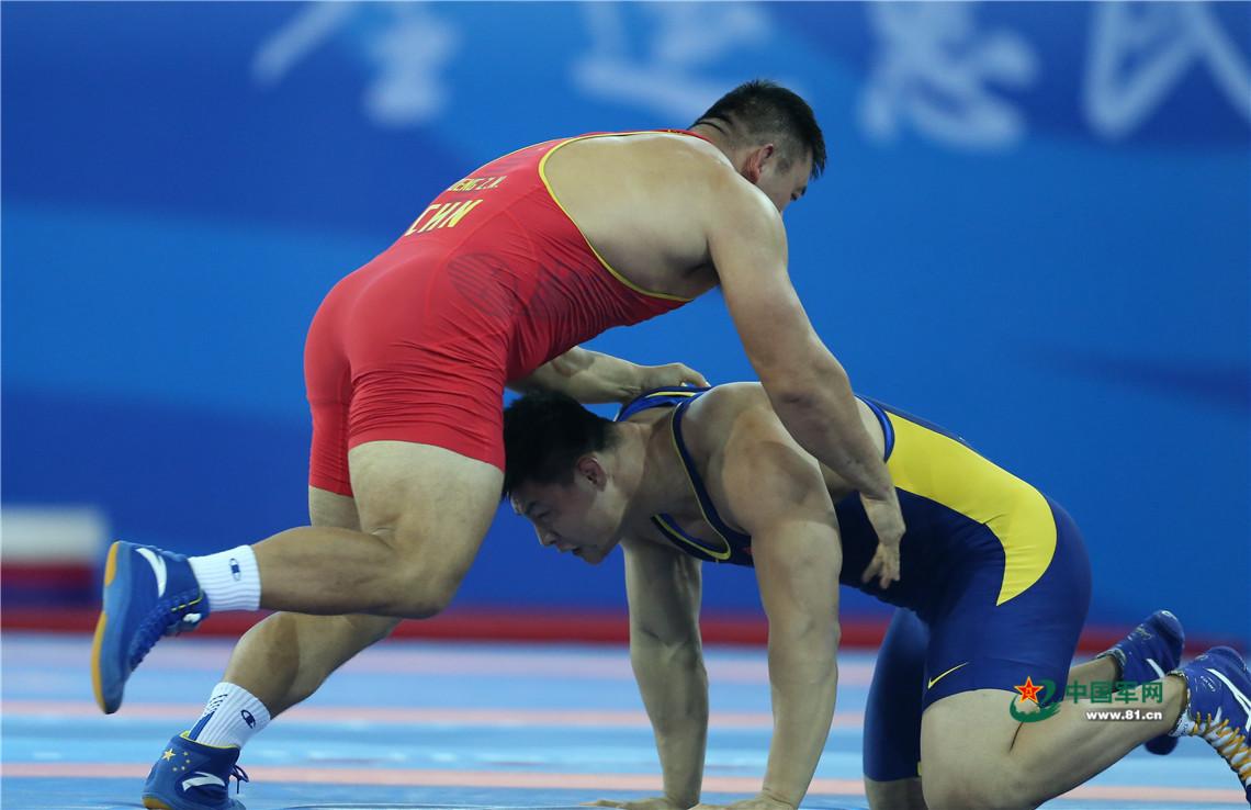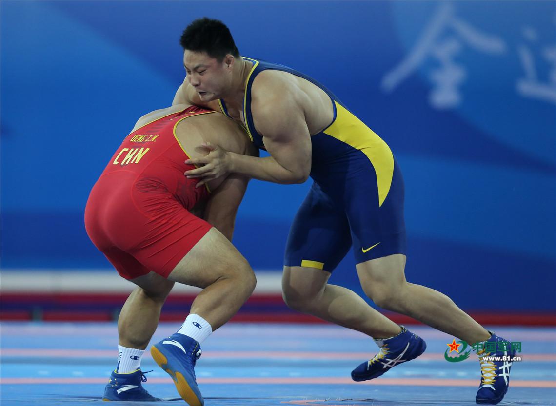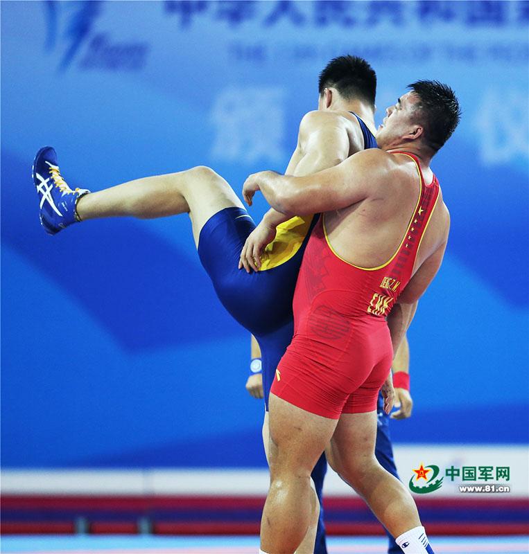 9月7日,天津全运会男子自由式125公斤级摔跤决赛,解放军队运动员邓志伟战胜山西队胡展翔获得冠军。中国军网记者张雷摄影