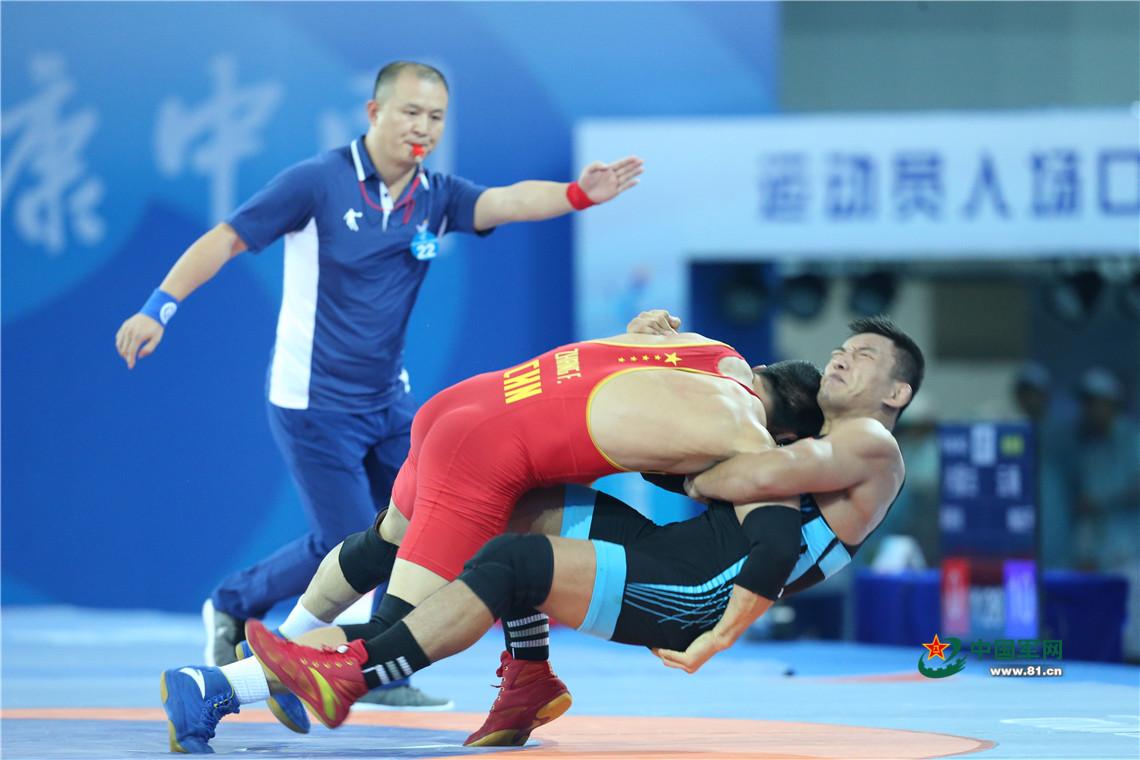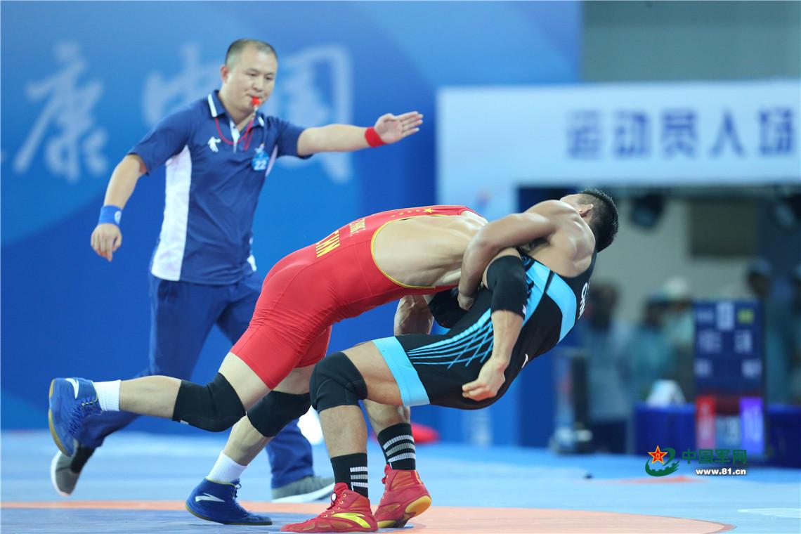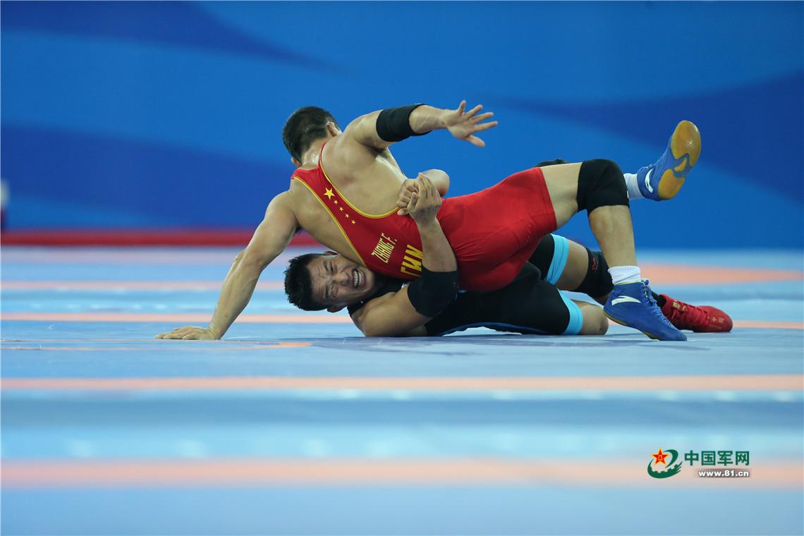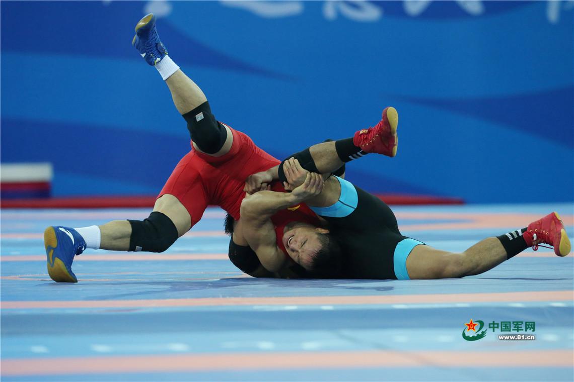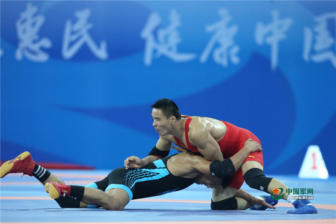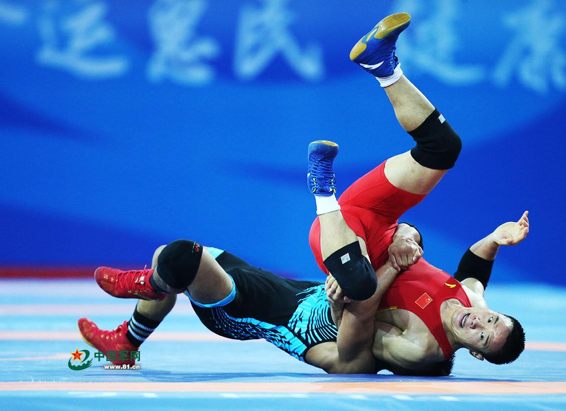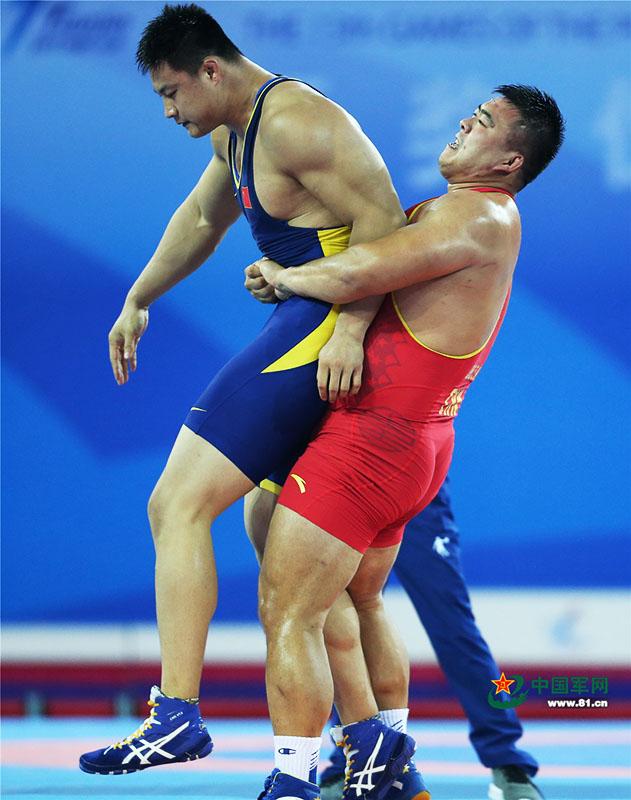 9月7日,天津全运会男子自由式125公斤级摔跤决赛,解放军队运动员邓志伟战胜山西队胡展翔获得冠军。中国军网记者张雷摄影