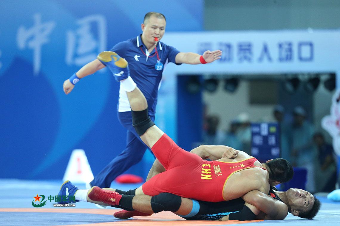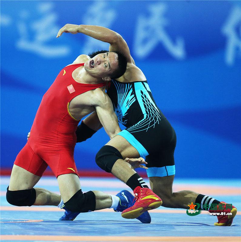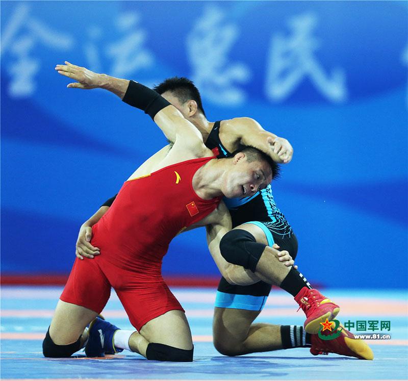 9月7日,在第十三届全运会男子自由式摔跤决赛中,运动员相互较量。中国军网记者张雷摄影