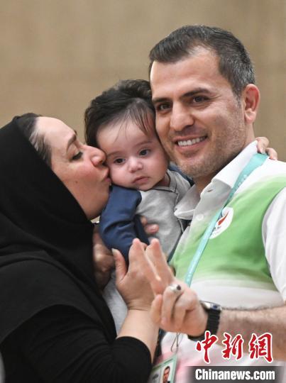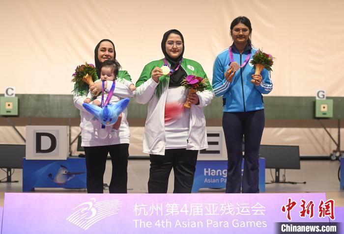 中新网杭州10月24日电(鲍梦妮)10月24日,在杭州第4届亚残运会SH1级女子10米气手枪决赛中,伊朗选手萨雷赫以233.0环的成绩获得亚军。颁奖典礼上,她抱着3个月大的儿子共享荣耀时刻。与奖牌、花束一同呈上的,还有官方特意赠予小朋友的杭州亚残运会吉祥物“飞飞”玩偶。