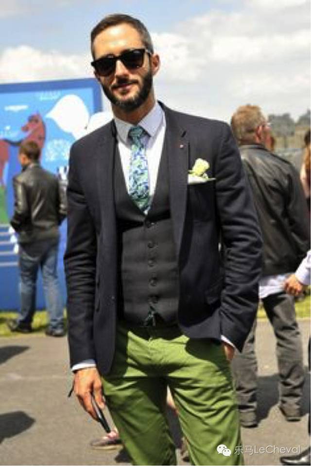 如果男士有机会进入只有马主才能进入的亮马圈,记得要按照要求佩戴领结或是领带,否则只能吃闭门羹了。如果觉得正装太过平淡,还可以戴上胸帕做为装饰。