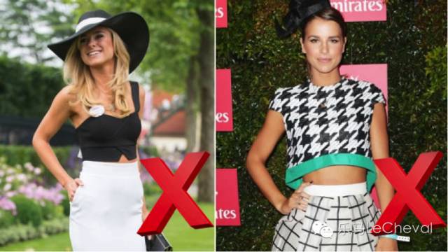 虽然露脐装、露背装、抹胸装很能显示身材,但要知道这可是高端赛马比赛,不是草莓音乐节之类云云,像下面这两种穿着都是不符合穿着要求,被明确禁止的。