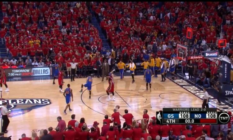 此时库里率先爆发,他连投带罚得到四分。此后面。见势不妙鹈鹕主帅蒙蒂-威廉姆斯赶紧请求暂停,暂停过后戴维斯补扣得手,但汤普森与格林连得4分,比分变成99-105。格林再次补篮得手和利文斯顿的罚球将分差追到只有三分。此时时间只剩下20.1秒,霍勒迪被犯规后两次罚球稳稳命中,再次将分差拉开到5分。时间只剩17.4秒,此时全场的主队球迷已经开始了尽情地舞蹈来迎来主队的胜利。
