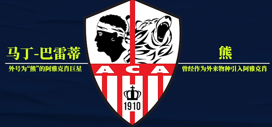 然而阿雅克肖俱乐部成立之初,和一艘停泊在港口的英国军舰船员们踢了场友谊赛。虽然1-3输了,但打入本队唯一进球的马丁-巴雷蒂体格壮硕且毛发旺盛,现场观众从此以后都根本不喊他的名字,直接喊「熊!熊进球了!熊又进球了!」喊着喊着,这只熊就登上了俱乐部的队徽。