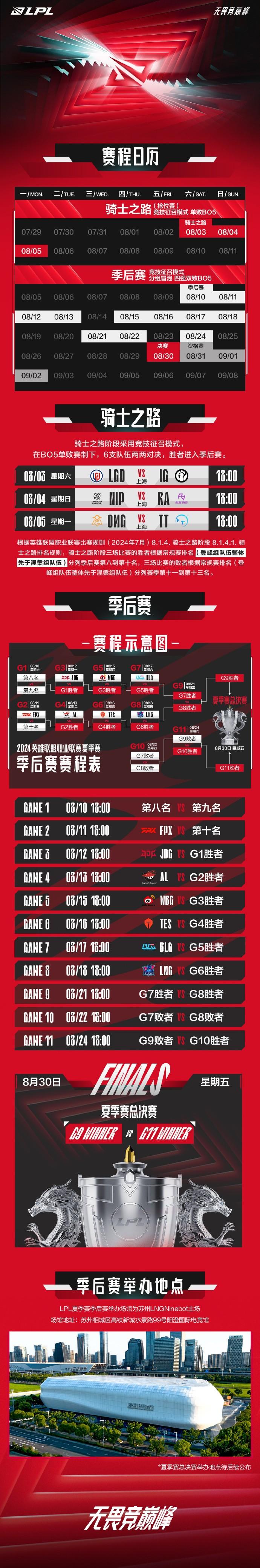 新征程新挑战,8月3日- 8月5日,2024LPL夏季赛骑士之路,8月10日- 8月24日,2024LPL夏季赛季后赛,场场皆关键,无畏竞巅峰!