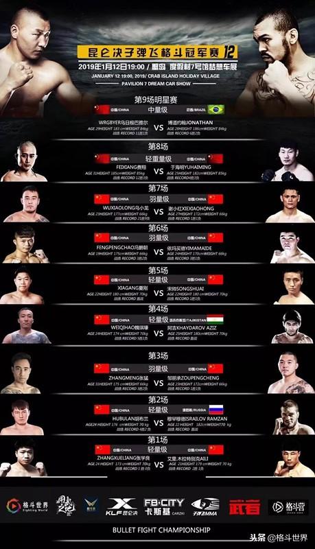 本次昆仑决子弹飞格斗冠军赛将于2019年1月12日晚19:00,北京蟹岛度假村7号馆FB·CITY梦想汽车展厅举行。此次比赛将会在昆仑决APP、格斗世界、用武之地、格斗迷等多家媒体进行全网直播。